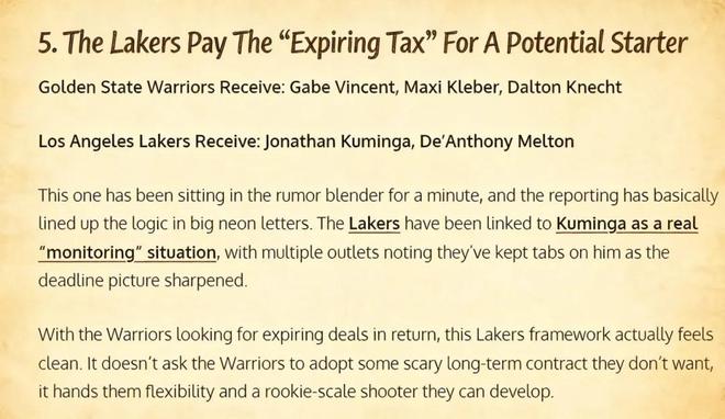 美媒《Fadeaway World》撰文建议,湖人应该考虑打包送出文森特、克莱伯以及克内克特,从勇士引入库明加和梅尔顿。