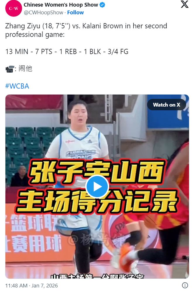 年仅18岁、身高达到7英尺3英寸(约2米21)的中国女篮新星张子宇,近日在职业赛场上的表现引爆社交媒体——因为她在WCBA赛场上,正面“碾压”多位WNBA成名球员。