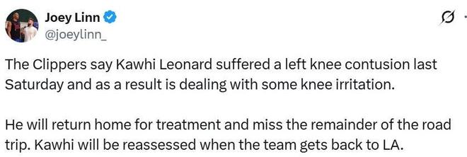 北京时间1月19日NBA联盟突然传来两条让人担忧的伤病报告,首先让球迷最牵挂的快船传来一条坏消息,快船官方宣布球队当家核心科怀伦纳德由于上一场比赛遭遇左膝挫伤,导致了膝盖产生炎症状态,为了保险起见球队决定让他直接退出客场比赛,提前回到洛杉矶接受治疗,具体的伤情以及复出都要等到球队打完接下来的两个客场(奇才、公牛)才能决定。