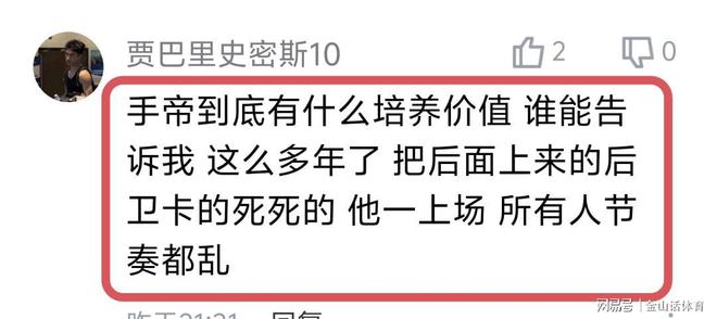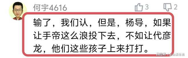 “手帝打成这样,还用,就不能上虎子何大牙?杨鸣水平呀”;“手帝到底有什么培养价值 谁能告诉我 这么多年了 把后面上来的后卫卡的死死的 他一上场 所有人节奏都乱”……
