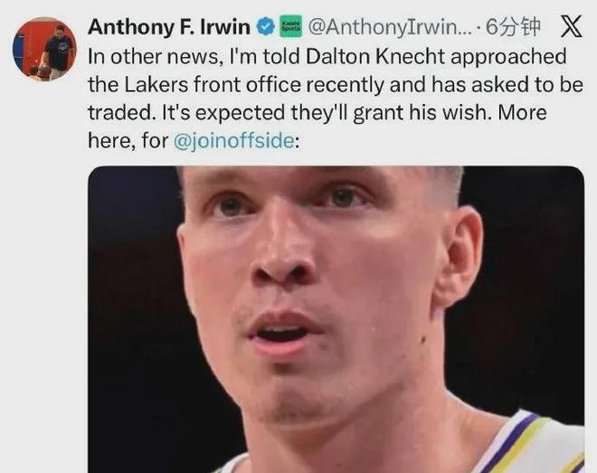 据美记报道,克内克特主动联系湖人管理层申请交易,预计会得到同意......