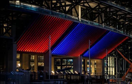 其中一项重要工程是外墙照明系统。目前测试工作已启动,相关效果图显示,装饰面板在点亮后能够呈现鲜明的红蓝色调。这些面板将作为三层看台外立面的装饰元素,进一步提升球场的夜间形象。目前仍有部分饰板尚未安装完毕。