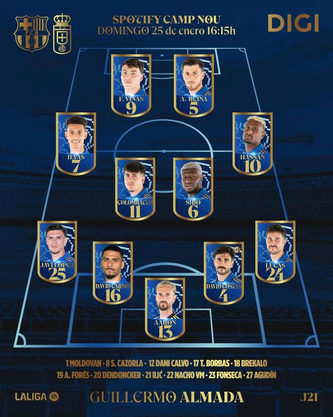 皇家奥维耶多首发:13-埃斯坎德尔、4-科斯塔斯、16-卡尔莫、24-阿伊哈多、25-哈维-洛佩斯、5-阿尔韦托-雷纳、6-西博、11-科伦巴托、7-沙伊拉、9-比尼亚斯、10-哈桑