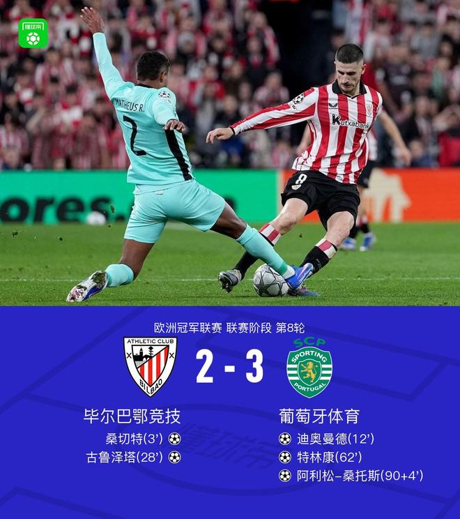 北京时间1月29日欧洲冠军联赛 联赛阶段 第8轮,毕尔巴鄂竞技对阵葡萄牙体育。毕尔巴鄂竞技桑切特破门,古鲁泽塔破门。葡萄牙体育迪奥曼德破门,特林康破门,阿利松-桑托斯破门。最终比分毕尔巴鄂竞技 2-3 葡萄牙体育。