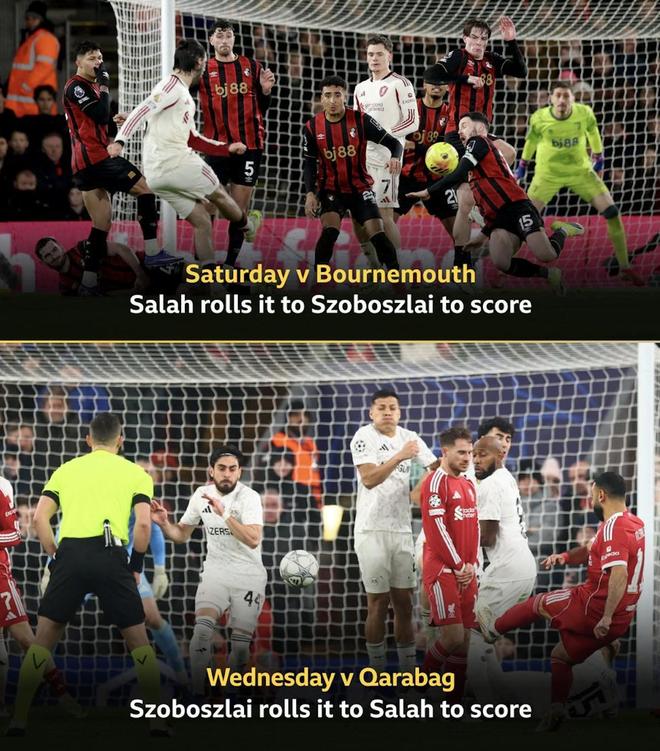 欧冠联赛阶段第8轮,利物浦主场对阵卡拉巴赫,下半场索博斯洛伊助攻萨拉赫破门,两人连续两场比赛通过战术任意球互相助攻。
