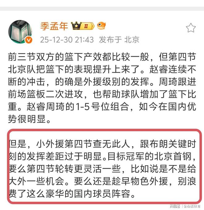 媒体人季孟年社媒发文点评道:“小外援第四节查无此人,跟布朗关键时刻的发挥差距过于明显。目标冠军的北京首钢,要么第四节轮转更灵活一些,比如说是不是给大外一些机会。要么还是趁早物色外援,别浪费了这么豪华的国内球员阵容。”。