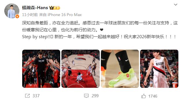 今天,小杨在微博上给球迷写了一段新年祝语