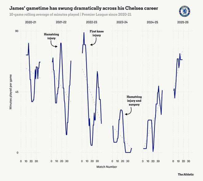 今晚切尔西主场对阵伯恩茅斯的比赛,将标志另一个里程碑:整整一年无伤病。自2024年11月腿筋受伤后,詹姆斯于12月30日切尔西客场0-2负于伊普斯维奇的比赛中,重返恩佐-马雷斯卡的比赛日名单。除三月一次短暂生病外,此后他的身体状态保持良好。