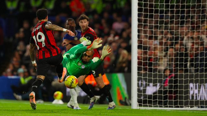 第18分钟,阿昌庞的传球出现失误,伯恩茅斯连续一脚传球,布鲁克斯险些梅开二度,桑切斯做出了关键扑救。