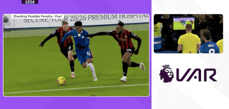 第12分钟,裁判叫停比赛,VAR介入,慢镜头显示,埃斯特旺突入禁区后,和塞梅尼奥有一个明显的身体对抗后倒地,裁判回看后判罚点球。