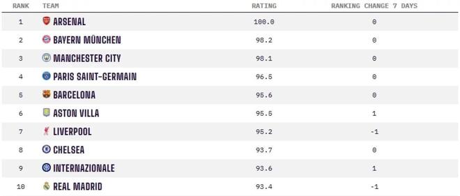 排名第四至第九位的俱乐部依次为:巴黎圣日耳曼(96.5)、巴塞罗那(95.6)、阿斯顿维拉(95.5)、利物浦(95.2)、切尔西(93.7)和国际米兰(93.6)。皇马在本期榜单中以93.4分位列第十位。