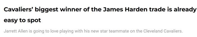 哈登加盟后,也让骑士中锋艾伦的表现明显提升。在哈登来之后的两场比赛中,艾伦场均25.5分11.5篮板1助攻;在哈登来之前,艾伦出战40场比赛,场均13.9分8.1篮板2.1助攻1.1抢断0.9盖帽。此前,加内特曾说哈登能让莫布利和艾伦每场多拿6-8分,现在看来,提升作用真的不小!克利夫兰媒体感慨,他成为哈登交易的最大赢家。