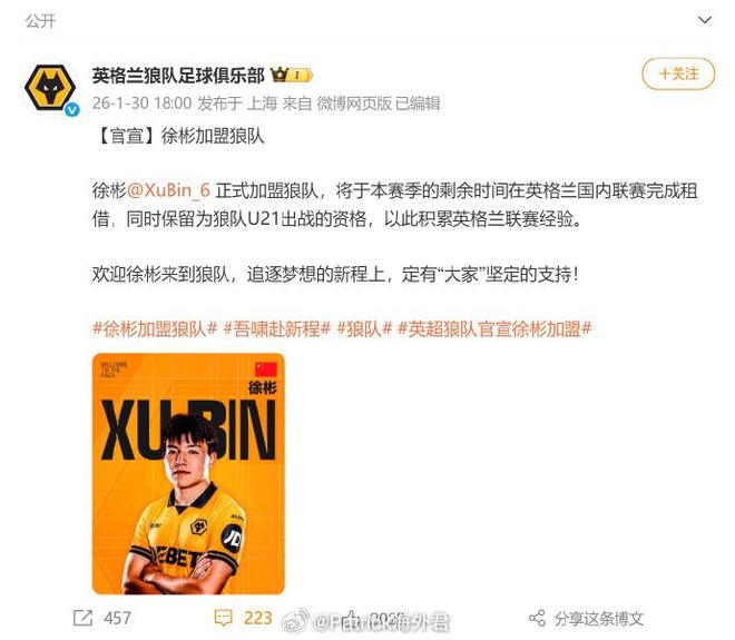 去EFL俱乐部 (例如国内盛传的Barnsley(注:巴恩斯利)): 确实如官宣所说,可保留狼队 U21 参赛资格,实现“双线作战”。不过EFL(英冠、英甲、英乙)属于职业联赛,受职业转会窗限制。冬窗已于2月3日凌晨关闭,目前仍无徐彬租借消息。极端情况,若徐彬仍是自由球员,还有一线机会。