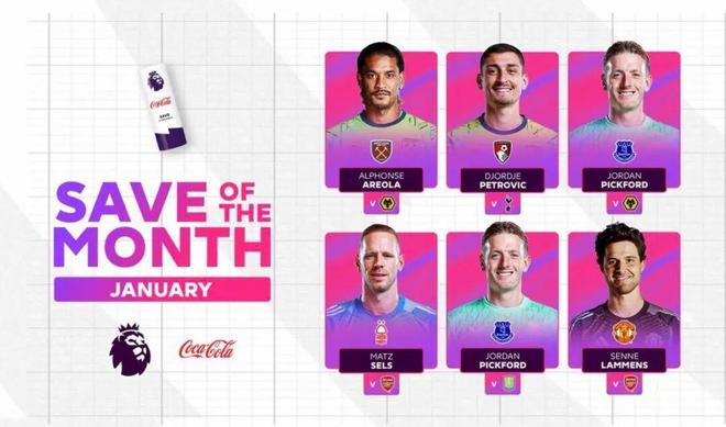 拉门斯在对阵阿森纳比赛中的扑救入围英超1月最佳扑救候选。