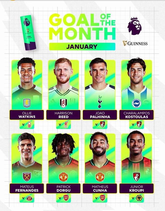 多尔古和库尼亚在对阵阿森纳比赛中的进球入围英超1月最佳进球候选;