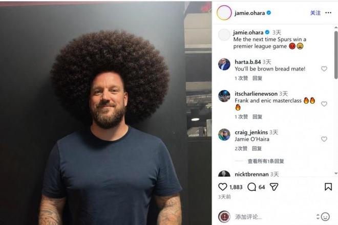 前热刺中场、评论员奥哈拉三天前曾在社交媒体上晒出一张搞笑图片,内容为自己变成爆炸头,配文:“热刺下次赢得英超比赛时的我。”这毫无疑问是玩了曼联“蓄发哥”球迷的梗。